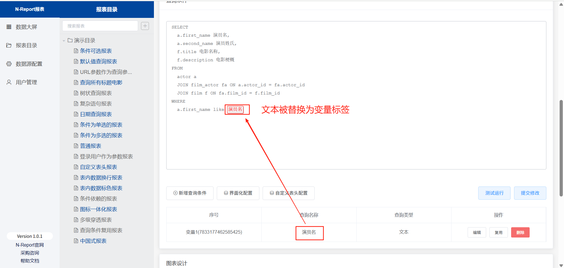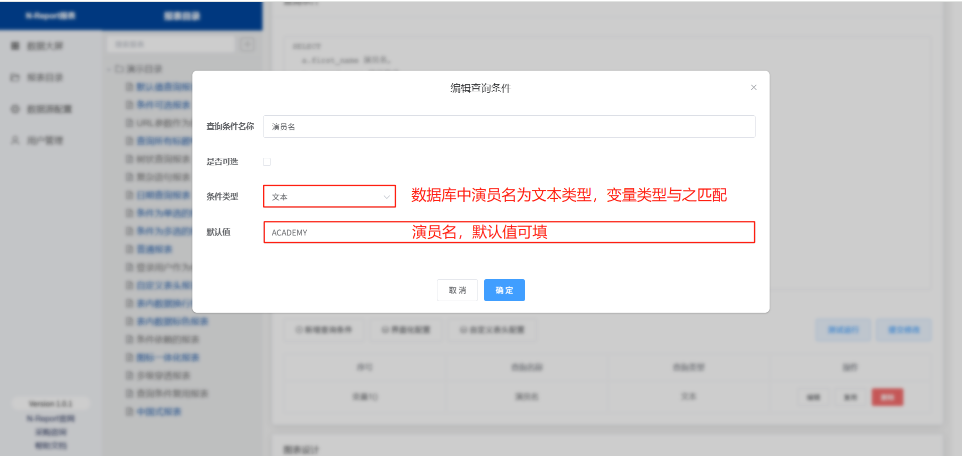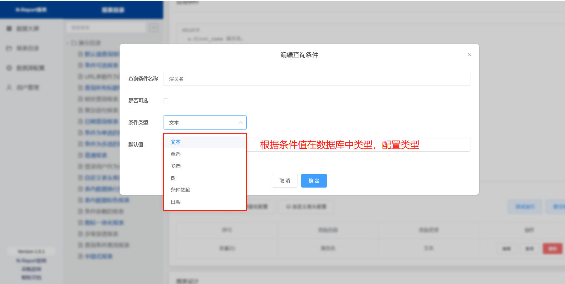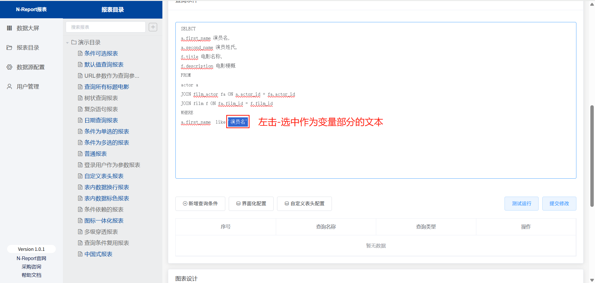 本节介绍如何通过文本划选生成 SQL 条件语句中的变量。变量类型支持文本类型,单选类型、多选类型、树、条件依赖、日期六类。