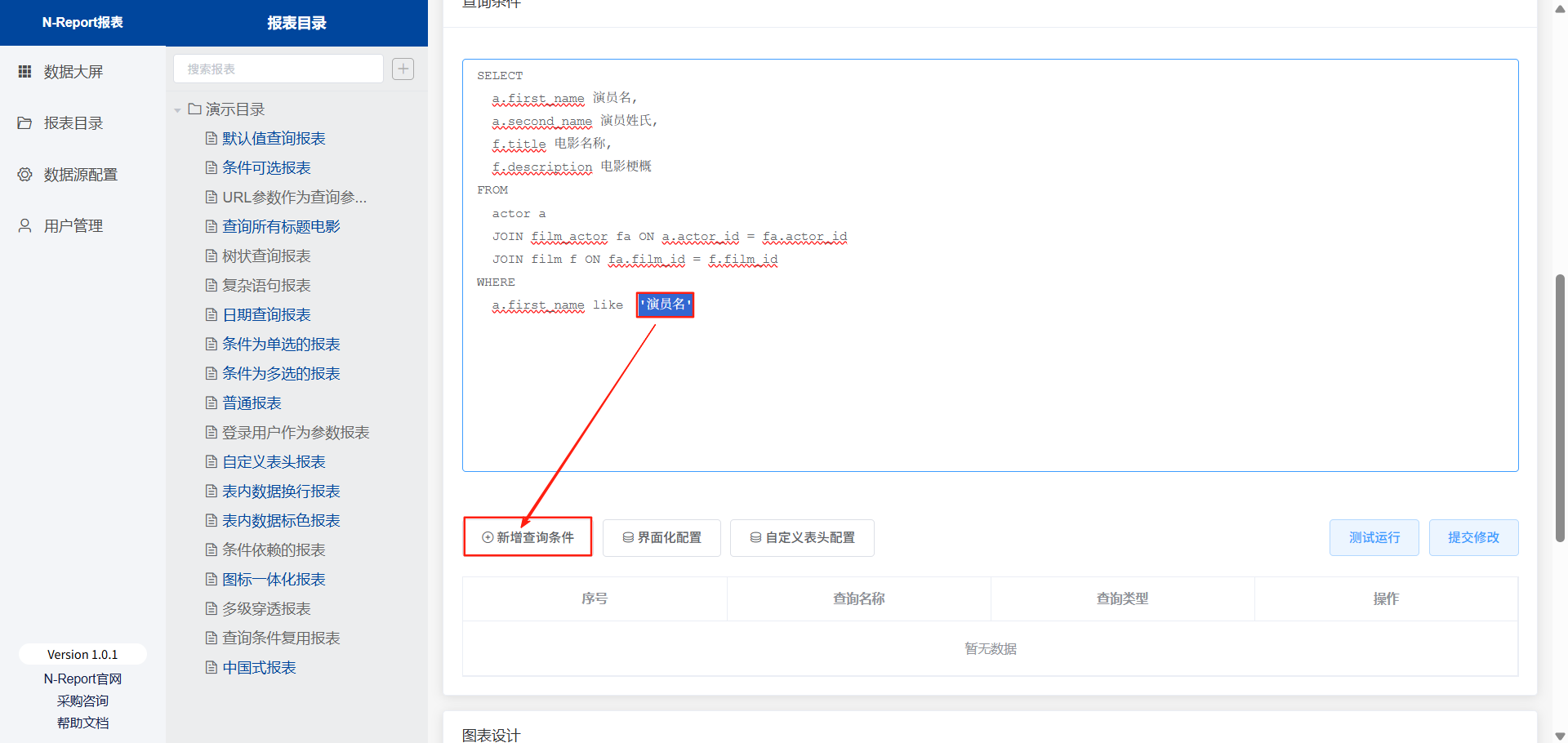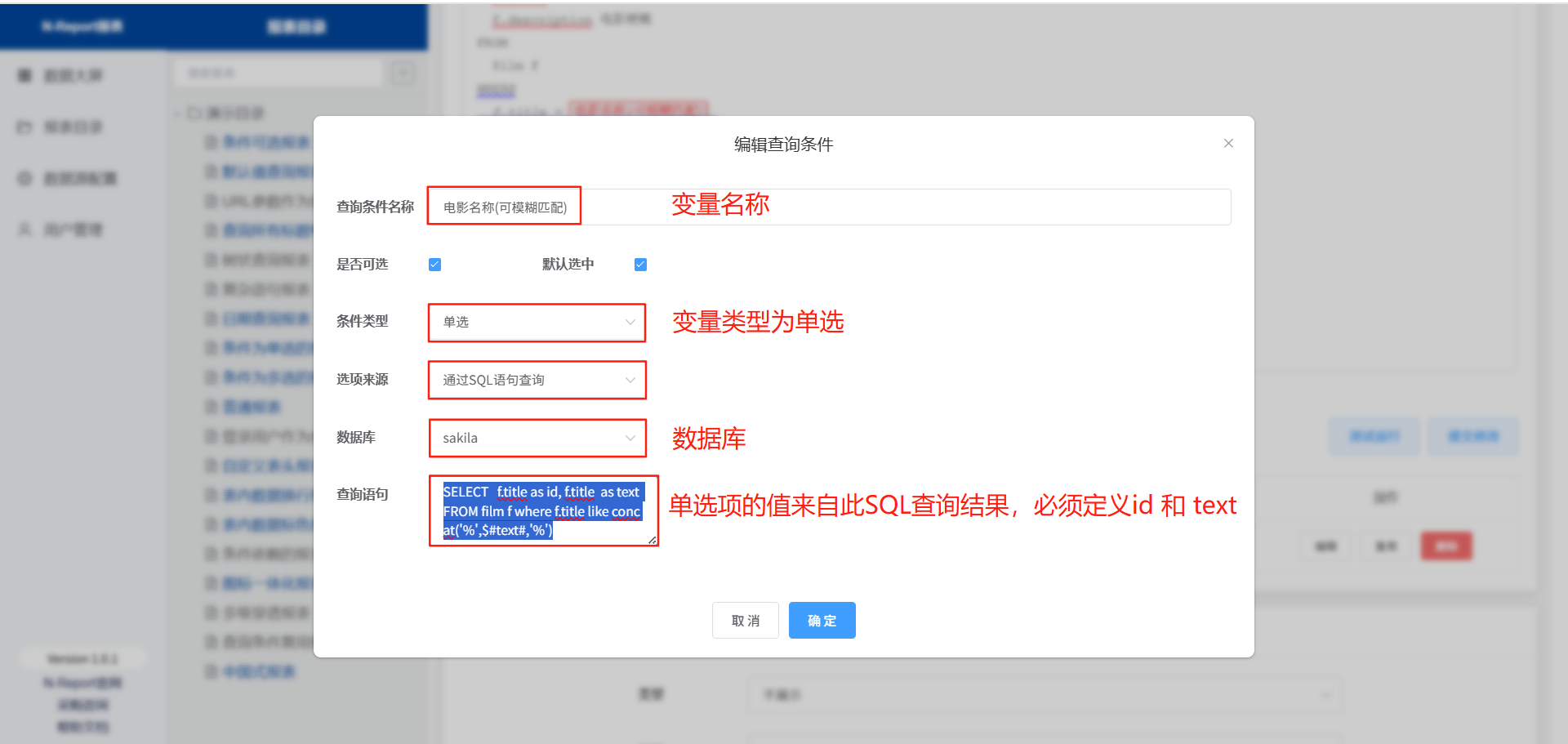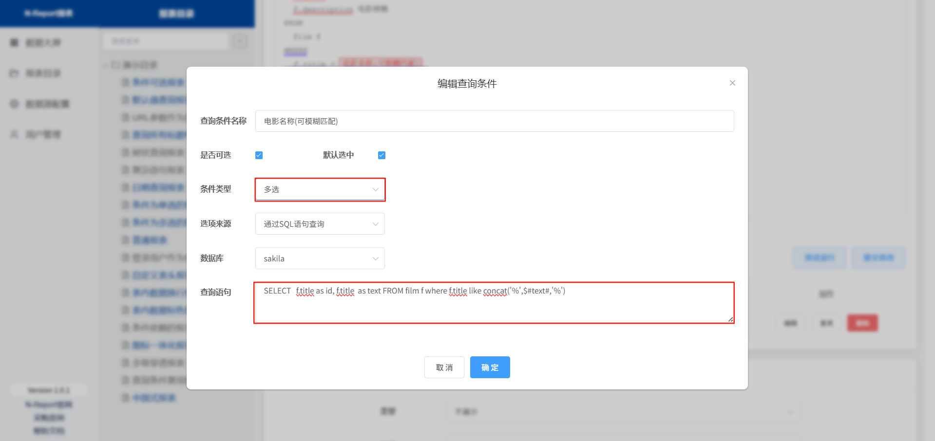 注:SQL中有且只有id 和 text 项。配置多选类型后,报表界面可以可以选多个值作为列表传入WHERE语句中。