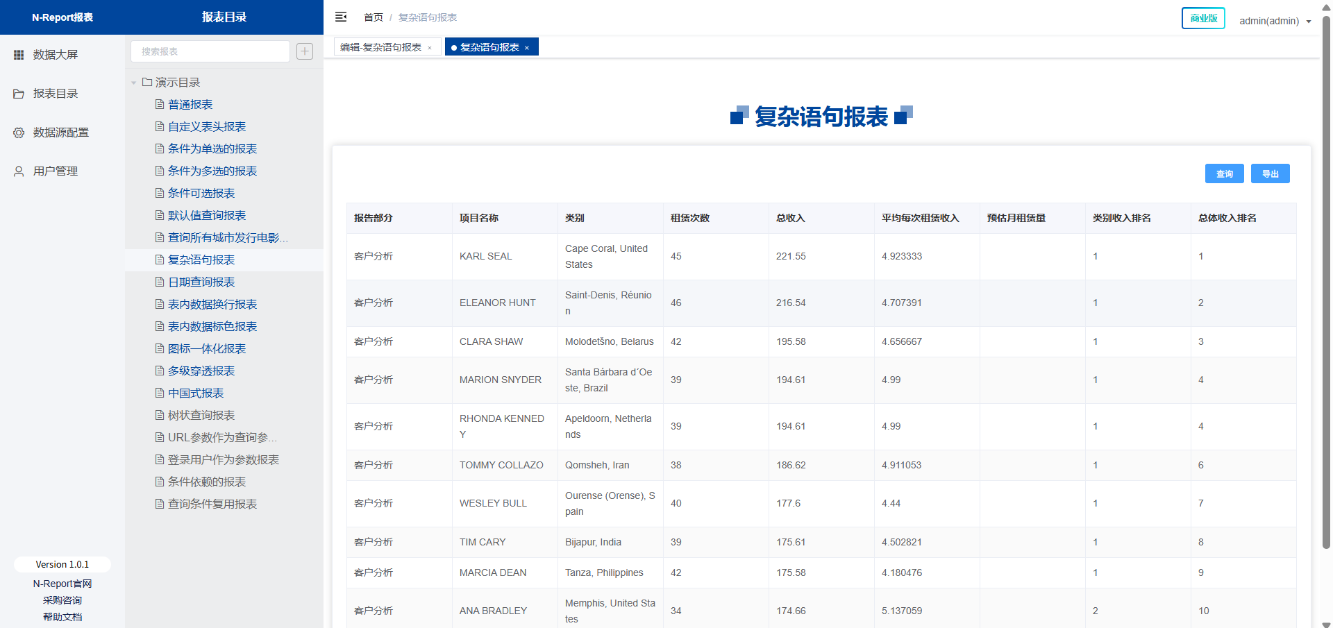 生成 电影表现分析、 客户分析 、 店铺表现分析综合性的分析报告,将三部分数据合并为一个结果集。包括报告部分标识(电影/客户/店铺),项目名称(电影名/客户名/店铺ID),类别信息(电影类别/客户所在城市国家/店铺所在城市国家),各项业务指标,两类排名:类别内排名和总体排名,按报告部分和总体收入排名排序。