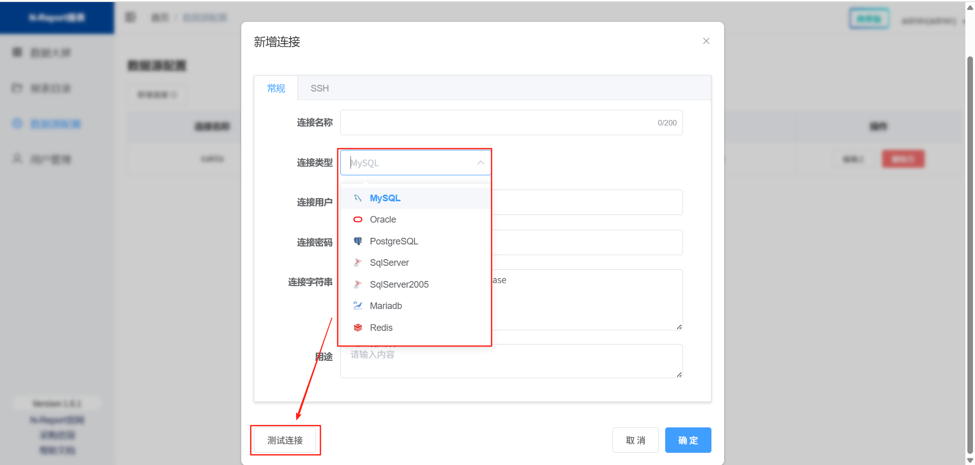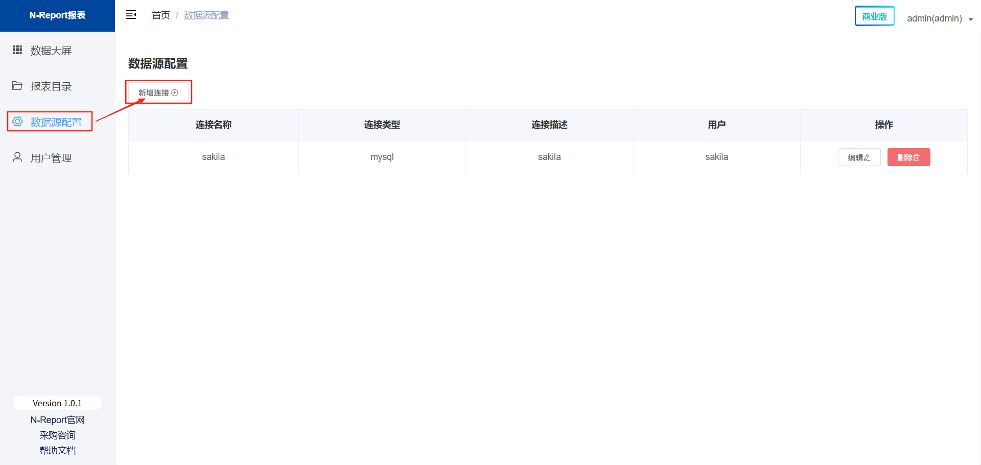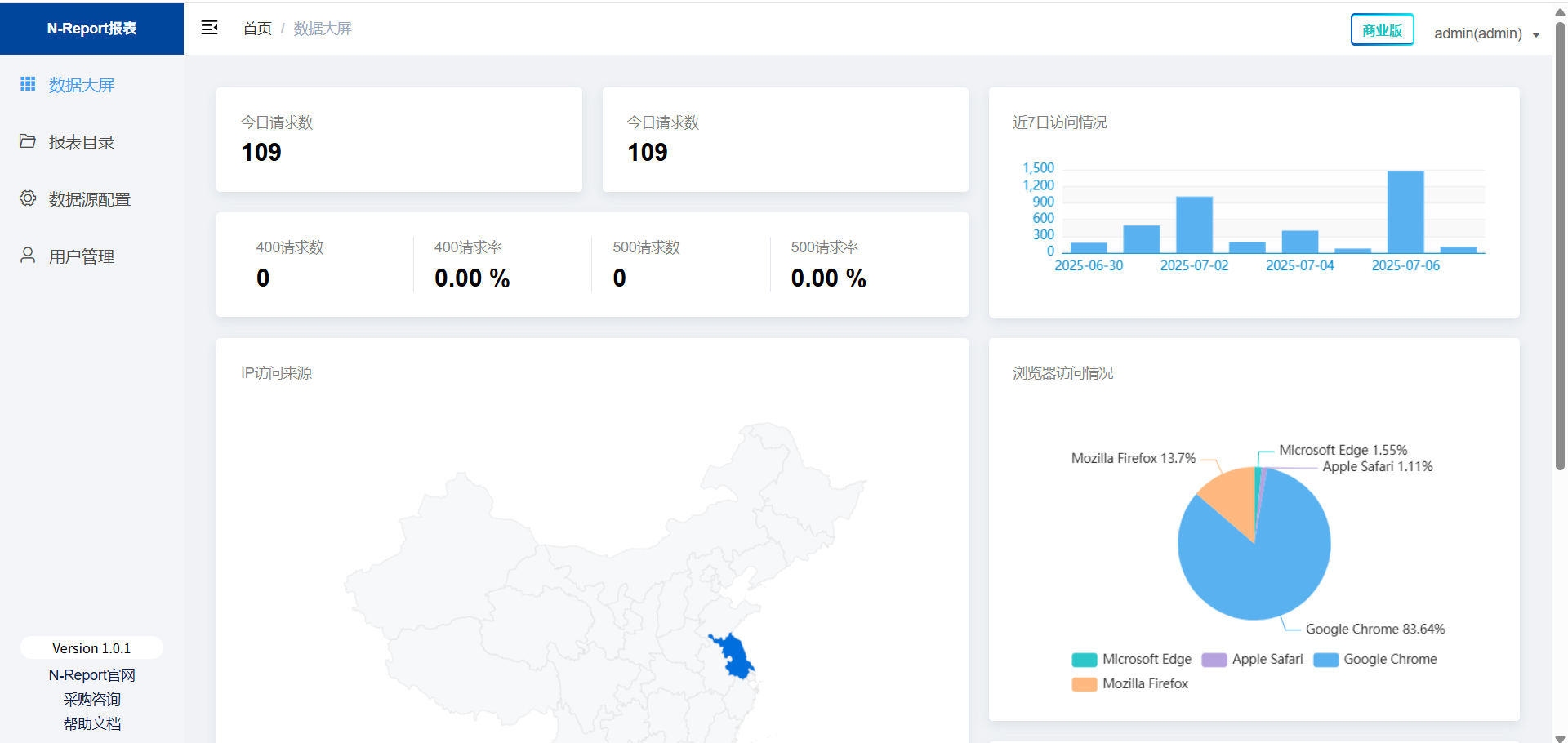 页面组件由:数据大屏、报表目录、数据源配置、用户管理四部分组成。